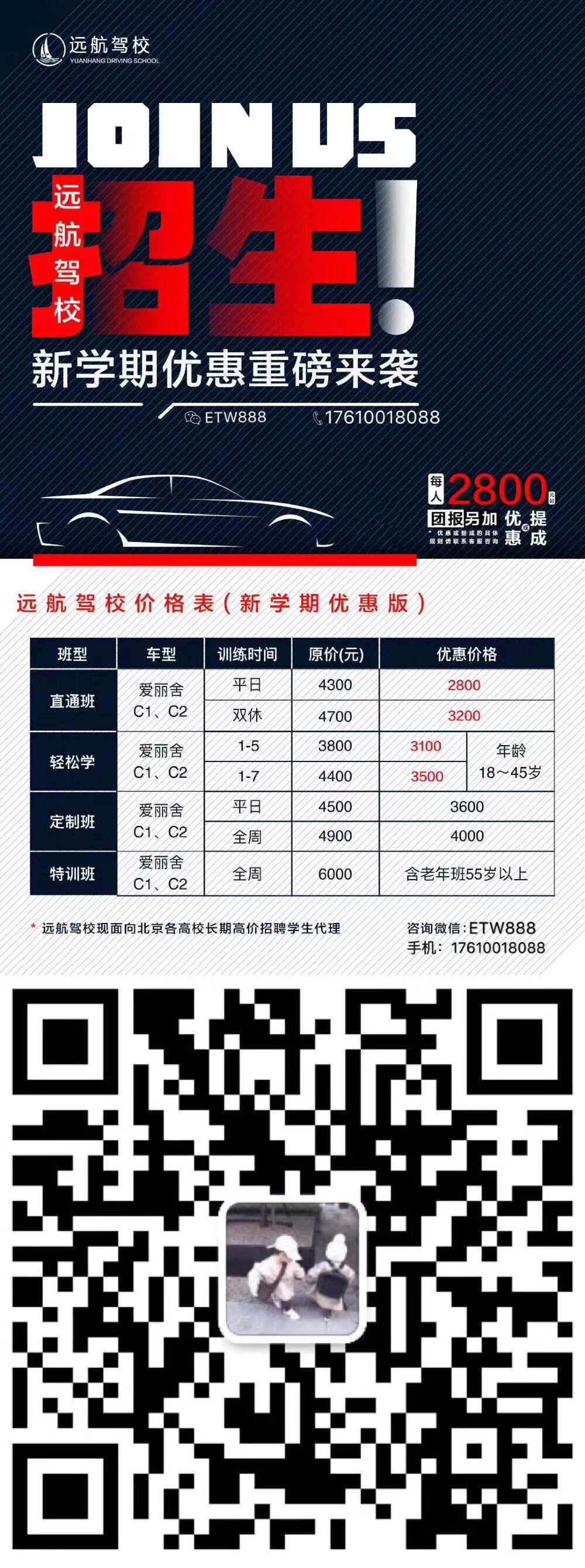 北京远航驾校新学期优惠活动价格低至2800元,一人一车一教练,最快45天轻松拿证,各位考驾照的不要错过机会。